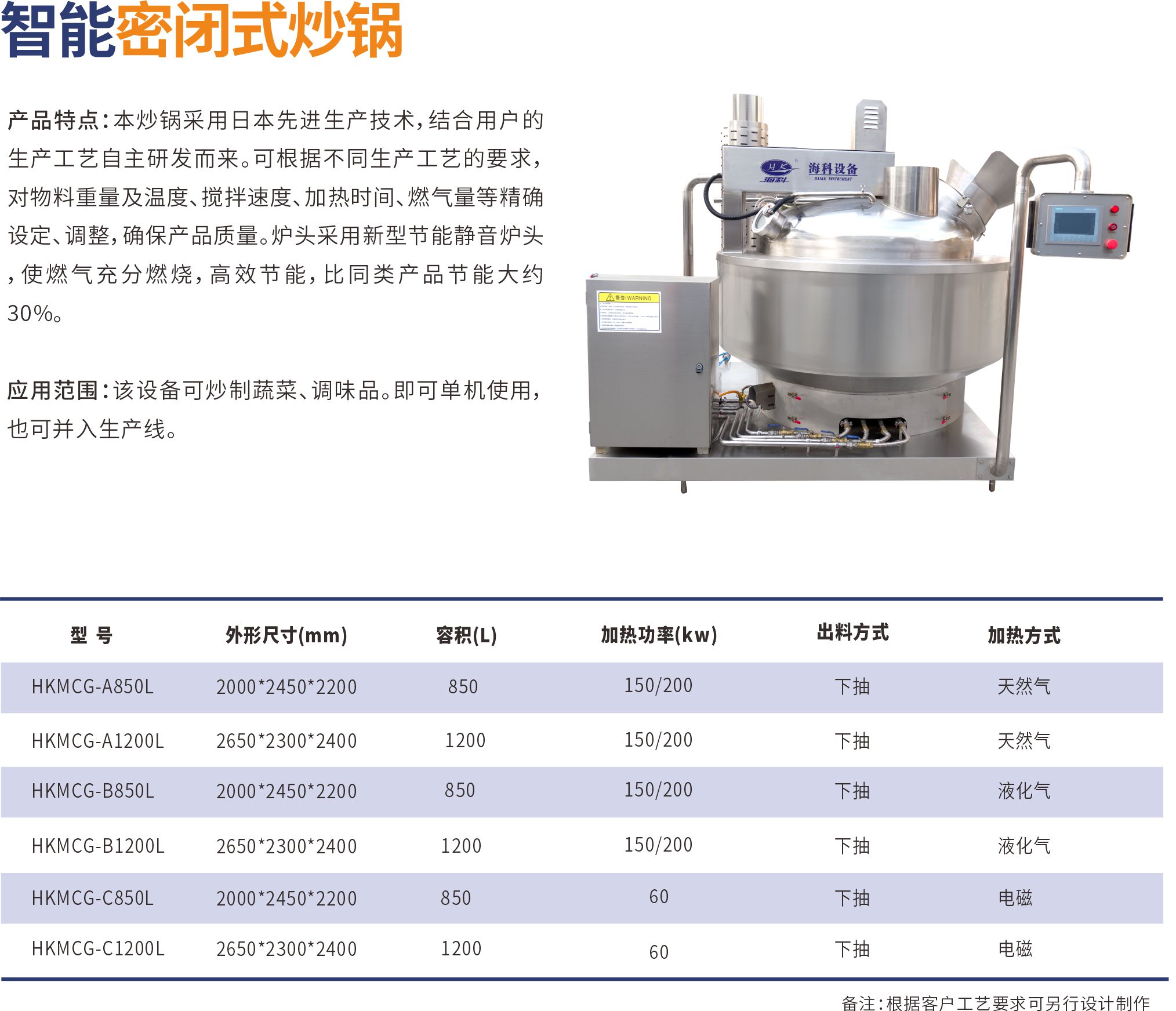 本炒鍋采用日本先進(jìn)生產(chǎn)技術(shù),結(jié)合用戶的生產(chǎn)工藝自主研發(fā)而來。可根據(jù)不同生產(chǎn)工藝的要求,對(duì)物料重量及溫度、攪拌速度、加熱時(shí)間、燃?xì)饬康染_設(shè)定、調(diào)整,確保產(chǎn)品質(zhì)量。爐頭采用新型節(jié)能靜音爐頭,使燃?xì)獬浞秩紵?,高效?jié)能,比同類產(chǎn)品節(jié)能大約30%。