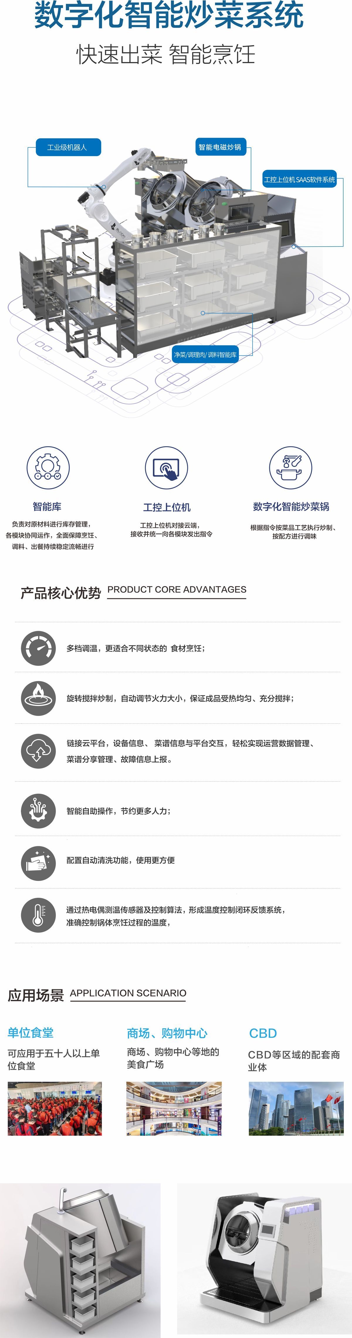 可用于集體用餐的食堂(機關、院校、工廠、中央廚房配餐中心等大型食堂)等場景量身打造的烹飪系統(tǒng),主要由空盆/成品智能庫、凈菜/調理肉/調料智能庫、工控上位機SaaS軟件系統(tǒng)、數字化智能炒菜鍋以及工業(yè)級機器人組成,工控上位機對接云端,接收并統(tǒng)一向各模塊發(fā)出指令。